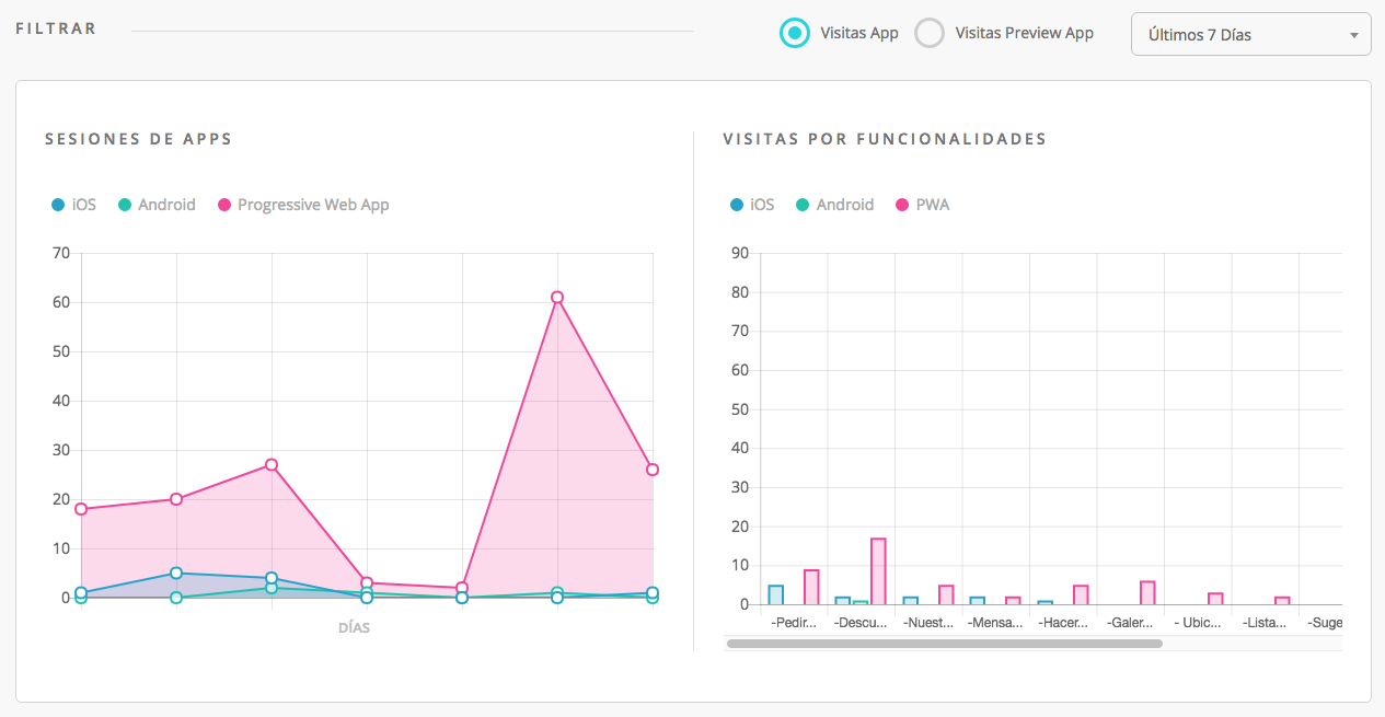 Aquí te enseñamos la vista de «Sesiones de Apps» y «Visitas por funcionalidades».